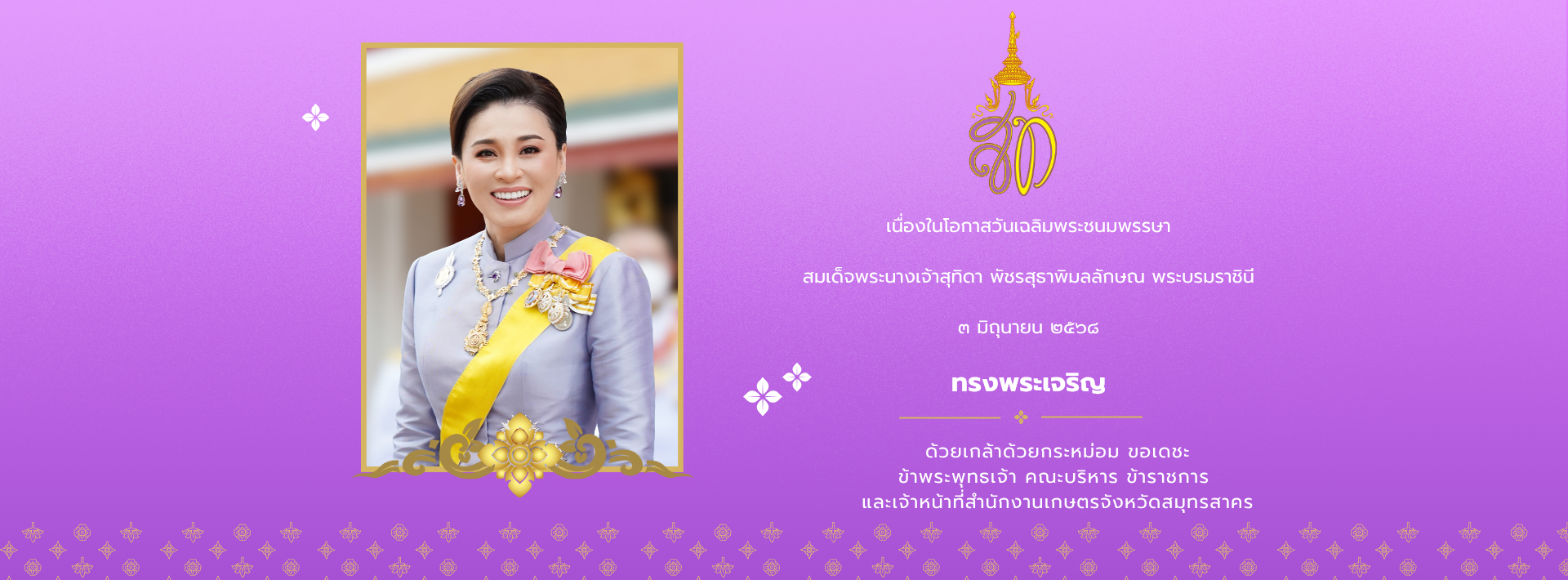 ขอเชิญร่วมลงนามถวายพระพร สมเด็จพระนางเจ้าสุทิดา พัชรสุธาพิมลลักษณ พระบรมราชินี เนื่องในโอกาสวันเฉลิมพระชนมพรรษา วันที่ 3 มิถุนายน 2568