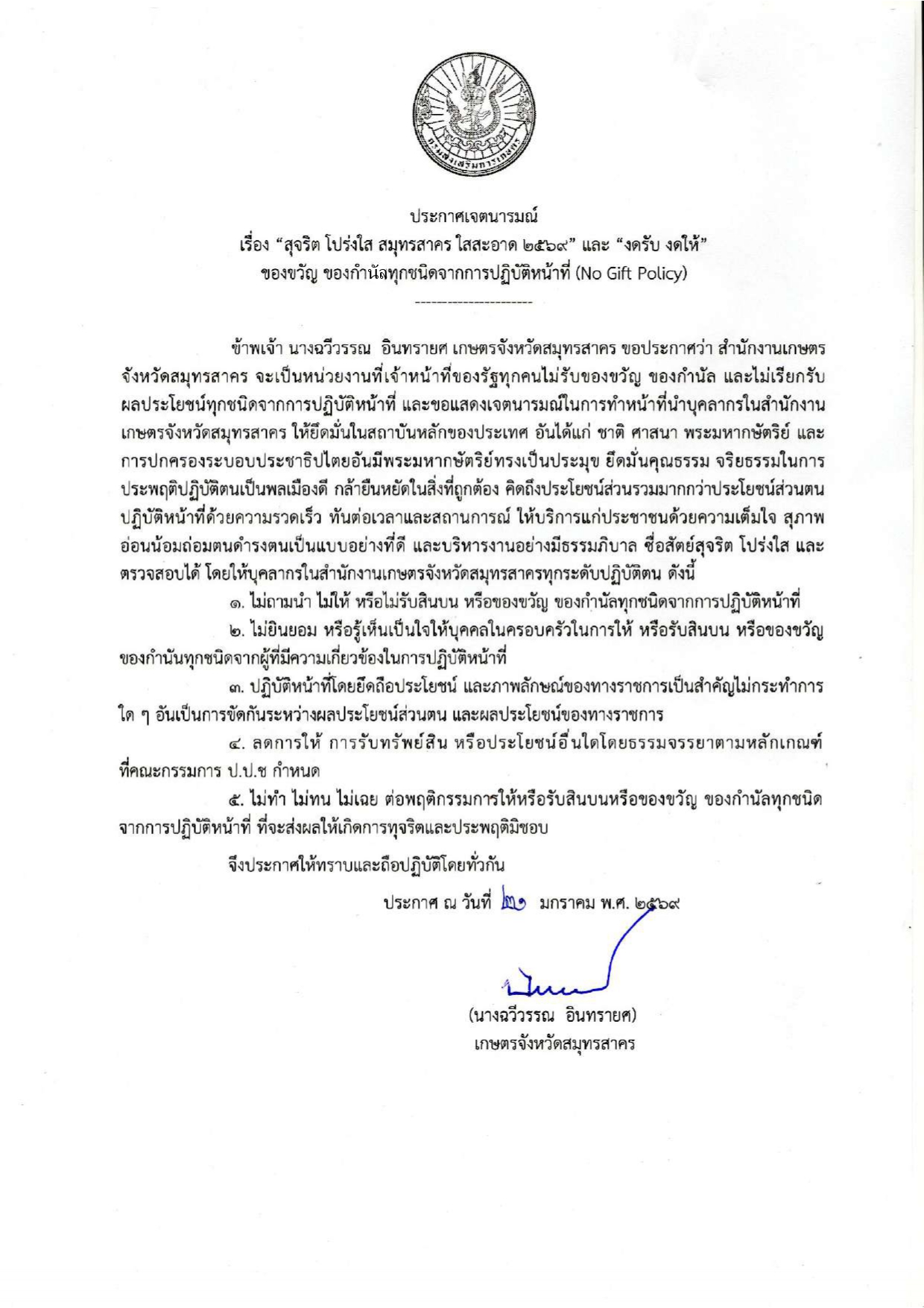 ประกาศเจตนารมณ์ เรื่อง “สุจริต โปร่งใส สมุทรสาคร ใสสะอาด 2569 และ “งดรับ งดให้” ของขวัญ ของกำนัลทุกชนิดจากการปฏิบัติหน้าที่ (์No Gift Policy)